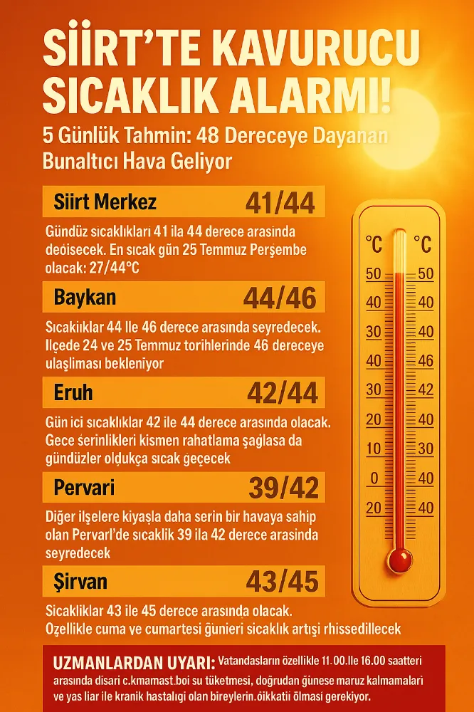 Bölgenin en sıcak ilçesi olan Kurtalan’da sıcaklık 48 dereceye kadar çıkacak. 24 ve 25 Temmuz kritik günler olarak öne çıkıyor.