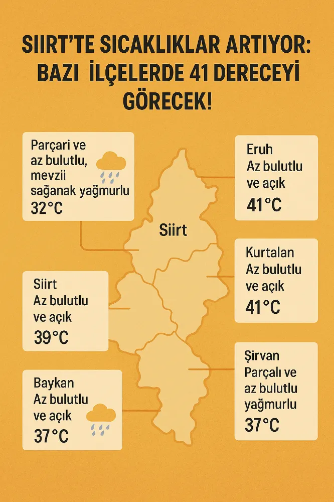 Özellikle Eruh ve Kurtalan ilçelerinde sıcaklıkların 41 dereceye kadar ulaşması öngörülürken, Baykan’da 39, Siirt merkezde 38, Tillo’da ise 35 derece civarında seyredecek. Öte yandan, Pervari ve Şirvan ilçelerinde parçalı bulutlu hava ile birlikte yerel sağanak yağış ihtimali bulunuyor.