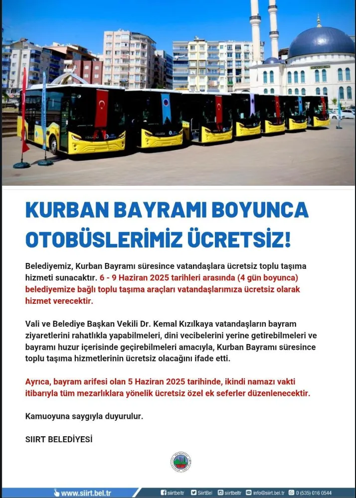 Siirt Belediyesi, Kurban Bayramı dolayısıyla vatandaşlara yönelik ücretsiz toplu taşıma hizmeti sunacaktır.