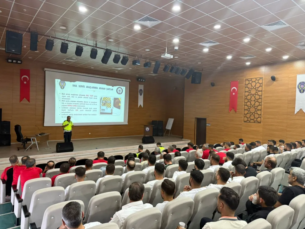 Siirt Emniyet Müdürlüğü Trafik Tescil ve Denetleme Şube Müdürlüğü ekipleri tarafından İl Emniyet Müdürlüğü konferans salonunda verilen eğitimde, 2025-2026 eğitim öğretim döneminde görev alacak servis şoförleri ve rehber personelin uyması gereken kurallar ayrıntılı şekilde aktarıldı.