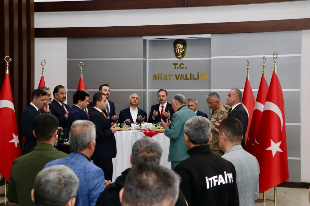 Siirt Valiliği tarafından organize edilen ve her yıl geleneksel hale gelen bayramlaşma töreni, Ramazan Bayramı’nda da gerçekleştirildi. Birlik ve beraberlik mesajlarının verildiği bu tören, kent halkı ile il protokolünü bir araya getirdi. Bayram kutlama programı, Siirt Valisi Dr. Kemal Kızılkaya, protokol üyeleri ve vatandaşların katılımıyla Siirt Valiliği’nde yapıldı. Bayramlaşmaya vatandaşların yanı sıra kurum müdürleri, muhtarlar, siyasi parti ve sivil toplum örgütlerinin temsilcileri ve basın mensupları da katıldı. Vatandaşların bayramını tebrik eden Vali Kızılkaya, birlik ve beraberlik mesajları verdi. Vali Kızılkaya, "Bayramlar, kardeşliği güçlendiren, paylaşımı hatırlatan müstesna günlerdir. Bu bayramda yardımlaşmayı artırmalı, sevgi ve hoşgörüyü yaşatmalıyız. Hedefimiz, huzur ve güven ikliminde şehrimizi daha ileriye taşımak ve halkımıza daha iyi bir yaşam kalitesi sunmaktır. Bu süreçte, Siirtli hemşehrilerimin katkı ve desteğini esirgemeyeceğine olan inancım da tamdır." dedi. Vatandaşlar ve kamu görevlileri ile yapılan bayramlaşma sonrası, Kezer yerleşkesinde bulunan Jandarma uygulama noktası, Kilit-1 Polis Uygulama noktası, Sevgi Evleri, 112 Acil Çağrı Merkezi, GAMER, İtfaiye Müdürlüğü ve Siirt Eğitim ve Araştırma Hastanesi çalışanları ve hastanede tedavi gören hastalar ziyaret edildi. Vali Kızılkaya, beraberinde Siirt Ak Parti Milletvekili Mervan Gül, Vali Yardımcısı Birkan Tatlısöz, İl Jandarma Komutanı Tuğgeneral Emrullah Büyük ve İl Emniyet Müdürü Necmettin Öztürk, Ak Parti İl Başkanı Av. Bahri Caner Özturan ile jandarma ve polis noktalarını ziyaret ederek, ekiplerin bayramını kutladı. Nöbet defterini imzalayan Vali Kızılkaya, güvenlik güçlerinin halkın huzur ve güvenliği için gece gündüz demeden çalıştığını belirtti. Kamu personeli ve vatandaşlarla sohbet eden Vali Kızılkaya, Ramazan Bayramı’nı kutladı.
