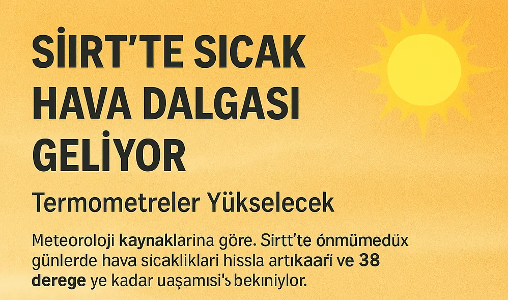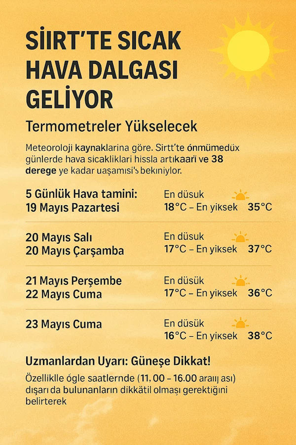 Meteoroloji kaynaklarına göre, Siirt'te önümüzdeki günlerde hava sıcaklıkları hızla artacak. Haftanın başından itibaren sıcaklıkların mevsim normallerinin üzerine çıkması ve 38 dereceye kadar ulaşması bekleniyor.5 Günlük Hava Tahmini:19 Mayıs Pazartesi: En düşük 18°C – En yüksek 35°C20 Mayıs Salı: En düşük 17°C – En yüksek 37°C21 Mayıs Çarşamba: En düşük 17°C – En yüksek 36°C22 Mayıs Perşembe: En düşük 16°C – En yüksek 37°C23 Mayıs Cuma: En düşük 16°C – En yüksek 38°CUzmanlar, özellikle öğle saatlerinde (11.00 – 16.00 arası) dışarıda bulunanların dikkatli olması gerektiğini belirterek, güneş çarpması riskine karşı bol su tüketilmesi, koruyucu ürünler kullanılması ve mümkün olduğunca gölgede kalınması gerektiğini vurguluyor.