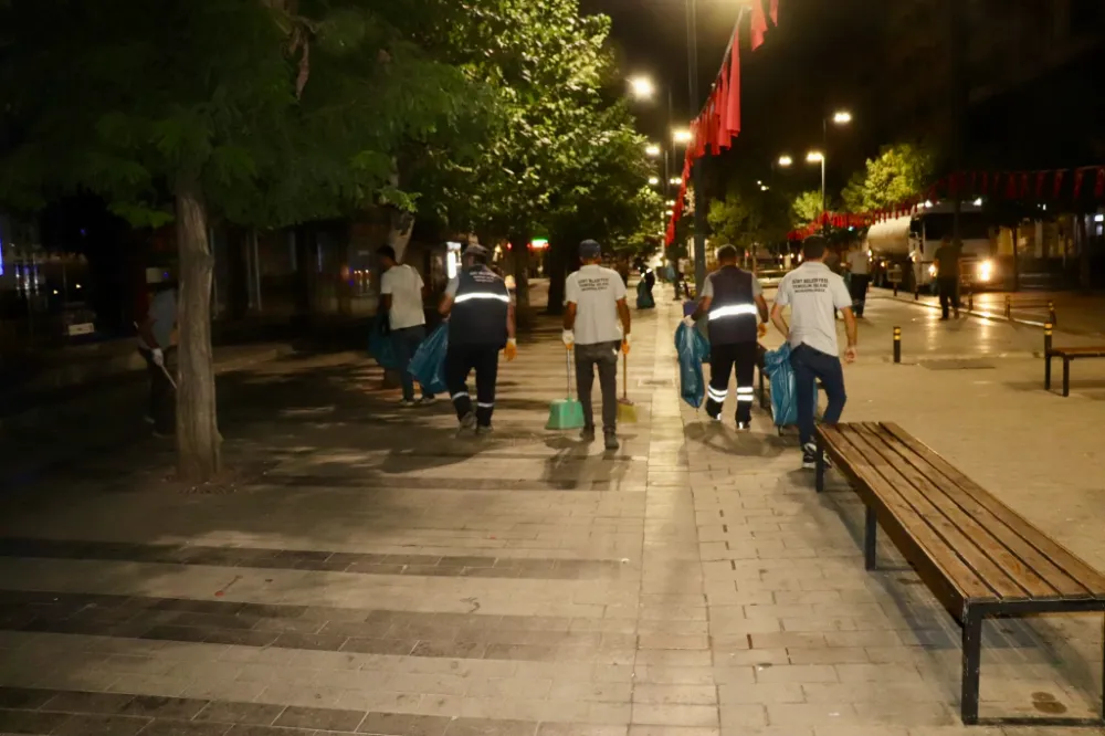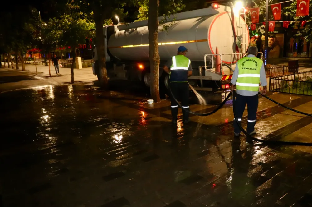 Halkın refahı ve sağlığı için ekipler, günün ilk ışıklarıyla birlikte okul çevrelerinde, cadde ve sokaklarda yoğun temizlik çalışmaları gerçekleştiriyor.