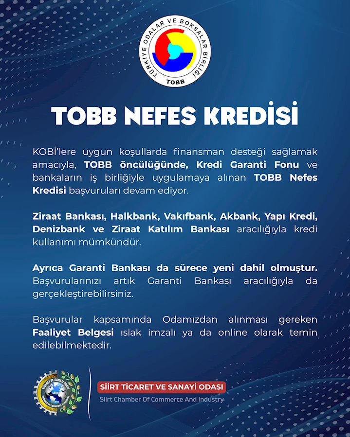 Türkiye Odalar ve Borsalar Birliği (TOBB) öncülüğünde, Kredi Garanti Fonu (KGF) ve bankalar iş birliğiyle hayata geçirilen TOBB Nefes Kredisi başvuruları Siirt’te de yoğun ilgi görüyor. Küçük ve orta ölçekli işletmelere (KOBİ) uygun koşullarda finansman desteği sunan uygulamada, bankalar listesi genişledi.