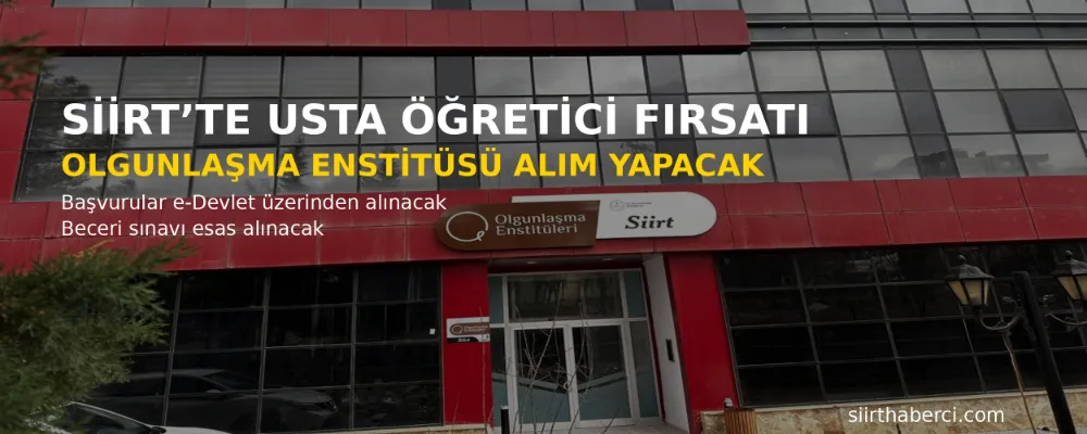 Siirt Olgunlaşma Enstitüsü, 2025–2026 Eğitim-Öğretim Yılı kapsamında yürütülecek tema ve projelerde görevlendirilmek üzere usta öğretici alımı yapacağını duyurdu. Farklı alanlarda gerçekleştirilecek alımların, uygulamalı beceri sınavı esas alınarak yapılacağı bildirildi.