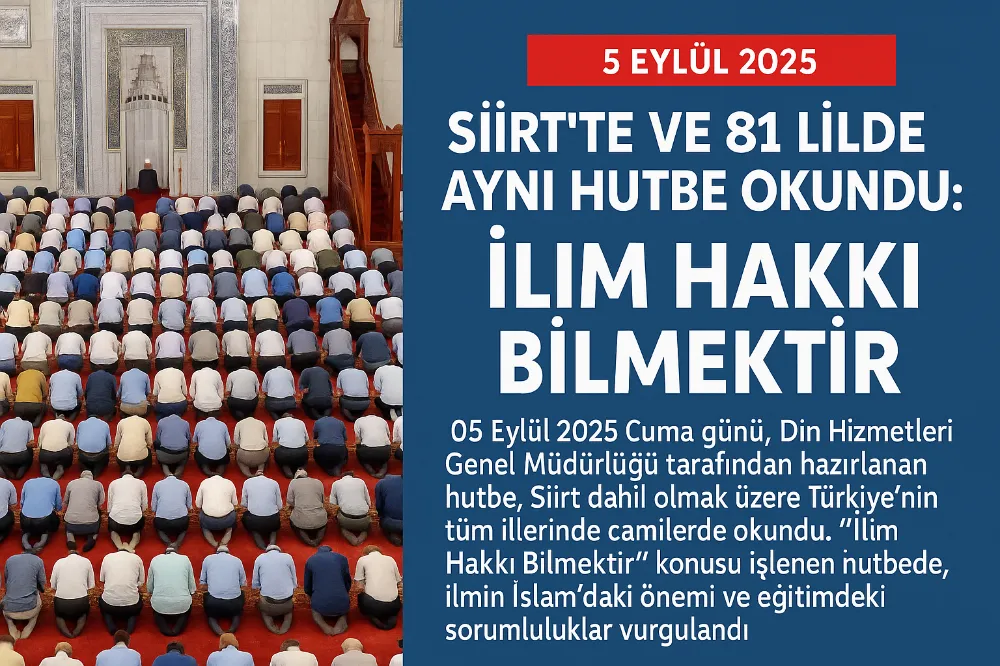 05 Eylül 2025 Cuma günü, Din Hizmetleri Genel Müdürlüğü tarafından hazırlanan hutbe, Siirt dâhil olmak üzere Türkiye’nin tüm illerinde camilerde okundu. Bu haftaki hutbenin konusu “İlim Hakkı Bilmektir” oldu.