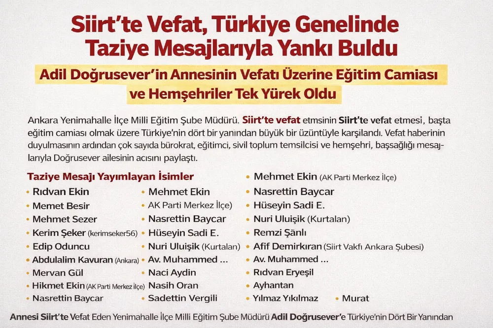 Ankara Yenimahalle İlçe Milli Eğitim Şube Müdürü Adil Doğrusever’in kıymetli annesinin Siirt’te vefat etmesi, başta eğitim camiası olmak üzere Türkiye’nin dört bir yanından büyük bir üzüntüyle karşılandı. Vefat haberinin duyulmasının ardından çok sayıda bürokrat, eğitimci, sivil toplum temsilcisi ve hemşehri, başsağlığı mesajlarıyla Doğrusever ailesinin acısını paylaştı.