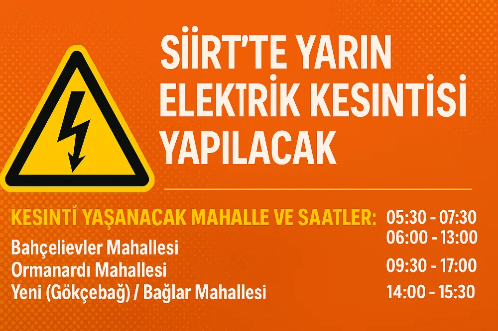Dicle Elektrik (DEDAŞ), 30 Mayıs 2025 Cuma günü Siirt merkezde planlı bakım ve yenileme çalışmaları nedeniyle elektrik kesintisi yapılacağını duyurdu. Kesinti, bazı mahallelerde belirli saatler arasında uygulanacak.