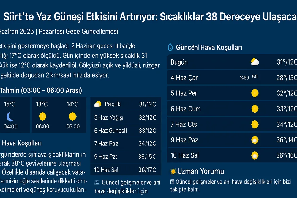Siirt'te yaz etkisini göstermeye başladı. 2 Haziran gecesi itibariyle hava sıcaklığı 17°C olarak ölçüldü. Gün içinde en yüksek sıcaklık 31°C, en düşük ise 12°C olarak kaydedildi. Hissedilen sıcaklık ise gece saatlerinde 17 derece civarındaydı. Gökyüzü açık ve yıldızlı, rüzgar ise sakin şekilde doğudan 2 km/saat hızla esiyor.