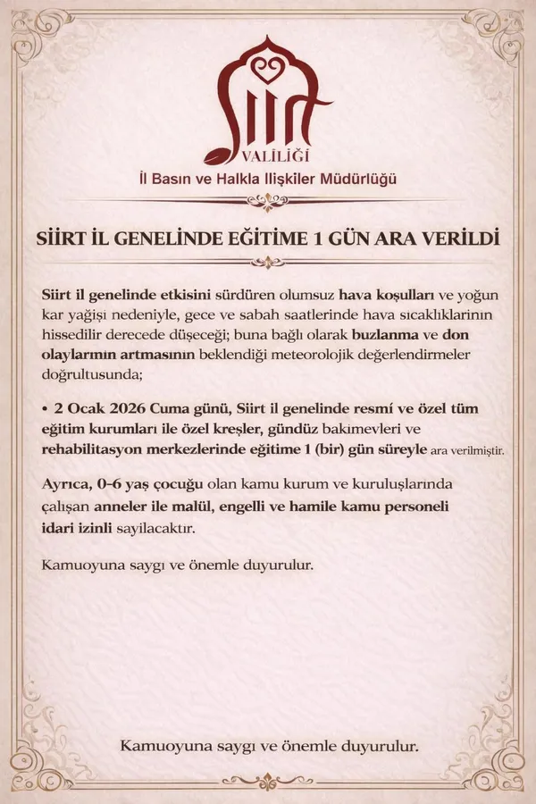 Bu kapsamda, 2 Ocak 2026 Cuma günü, Siirt il genelinde resmî ve özel tüm eğitim kurumları, özel kreşler, gündüz bakımevleri ile rehabilitasyon merkezlerinde eğitime 1 (bir) gün süreyle ara verilmesi kararlaştırıldı.