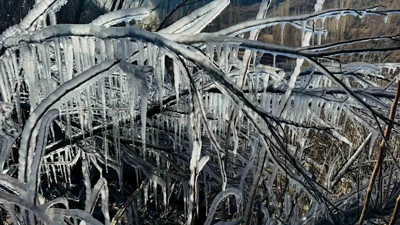 Şırnak’ın Beytüşşebap ilçesinde hava sıcaklığı eksilere düşünce ağaçlarda buz sarkıtları oluştu.