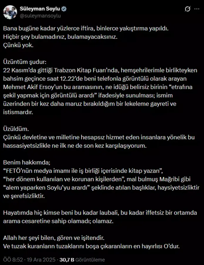 Soylu, 22 Kasım’da Trabzon Kitap Fuarı’nda hemşehrileriyle sohbet ederken, Mehmet Akif Ersoy’un kendisini saat 12.22’de görüntülü aradığını ve bu aramanın çarpıtılarak farklı bir şekilde kamuoyuna sunulduğunu belirtti. “Bu, ismim üzerinden yürütülen bir karalama girişimidir.” diyerek tepki gösterdi.