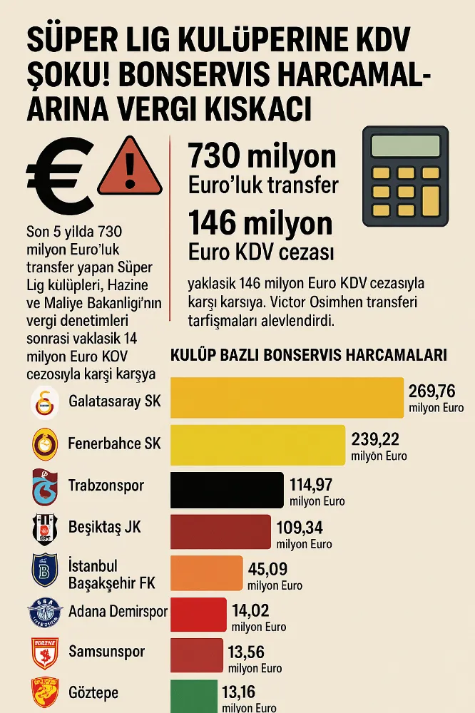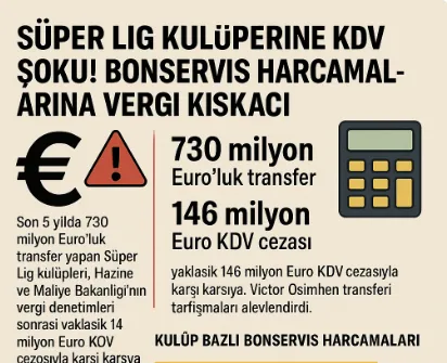 Son 5 yılda 730 milyon Euro’luk transfer yapan Süper Lig kulüpleri, Hazine ve Maliye Bakanlığı’nın vergi denetimleri sonrası yaklaşık 146 milyon Euro KDV cezasıyla karşı karşıya. Victor Osimhen transferi tartışmaları alevlendirdi.