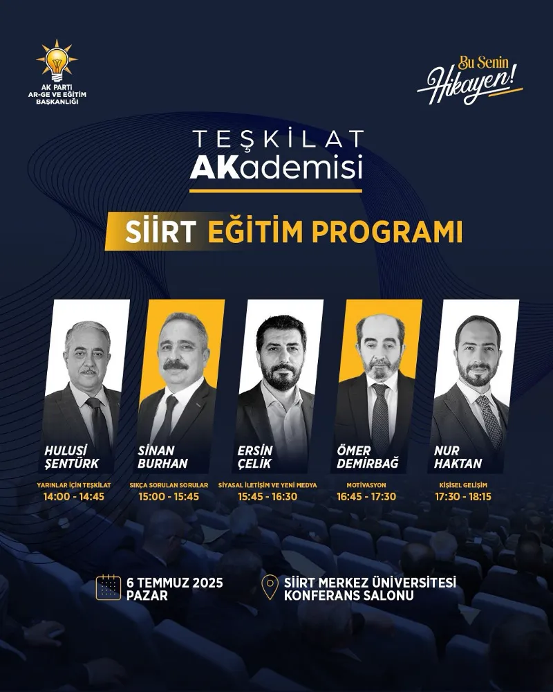 AK Parti Genel Merkez Ar-Ge ve Eğitim Başkanlığı tarafından organize edilen Teşkilat Akademisi Eğitim Programı, 6 Temmuz 2025 Pazar günü Siirt Merkez Üniversitesi Konferans Salonunda gerçekleştirilecek. “Bu Senin Hikayen” temasıyla düzenlenen programa, tüm teşkilat mensuplarının katılımı bekleniyor.