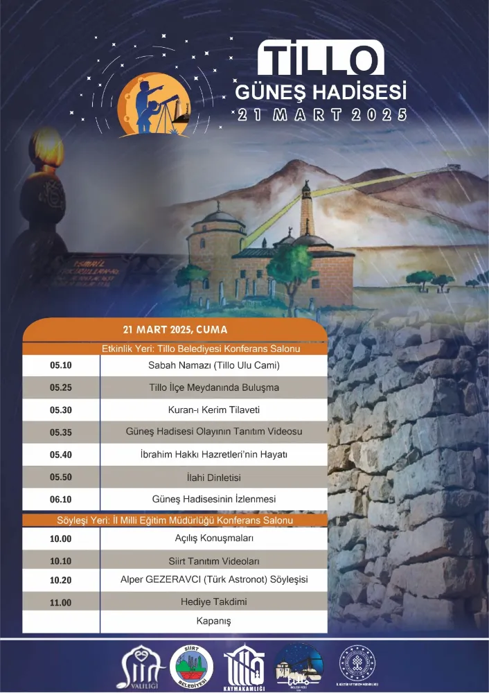 21 Mart’a, eşsiz bir bilim ve doğa harikası olan Tillo Güneş Hadisesi ile Etkinliği için tüm halkımızı Tillo’ya davet ediyoruz. Güneş Hadisesi, astronomi ve mimari açıdan dünyada benzersiz bir olay olarak dikkat çekmektedir. Bu özel etkinliklerde, gökyüzünün derinliklerini keşfetme ve doğanın büyüleyici ışık oyunlarını izleme fırsatını kaçırmayın. Etkinlik detayları şu şekildedir: 21 Mart Cuma • 5:00 Tillo İlçe Meydanında Buluşma • Kur’an-Kerim Tilaveti-İlahiler • İbrahim Hakkı Hz. Hayatı • 6:10 Güneş Hadisesinin izlenmesi Bu unutulmaz etkinlikte, hem gökyüzünün güzelliklerine tanıklık etmek hem de tarihin ve doğanın iç içe geçtiği bu büyüleyici deneyimi yaşamak için tüm halk davet edildi.