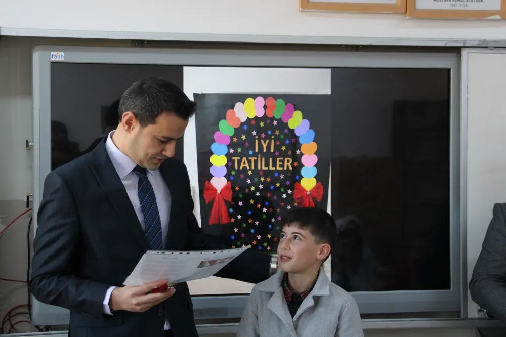 Tillo Kaymakamı Mehmet Ali Semiz, İbrahim Hakkı İlköğretim Okulu’nda karne dağıtımına katıldı. Kaymakam Mehmet Ali Semiz, 2024-2025 Eğitim Öğretim Yılı birinci dönemin sona ermesi münasebetiyle İbrahim Hakkı İlköğretim Okulu’nda düzenlenen karne törenine katıldı. Sınıfları tek tek gezerek öğrencilerle sohbet eden Kaymakam Semiz, öğrencilere karnelerini dağıttı. Karne dağıtım töreninde konuşan Kaymakam Semiz “Geleceğimizin teminatı olan öğrencilerimiz, emek ve gayretlerinin karşılığını alarak yarıyıl tatiline girdiler. Tüm öğrencilerimize, öğretmenlerimize ve idarecilerimize başarılı, huzurlu ve keyifli bir tatil diliyorum. Emeği geçen velilerimize de teşekkür ediyorum” ifadelerini kullandı.