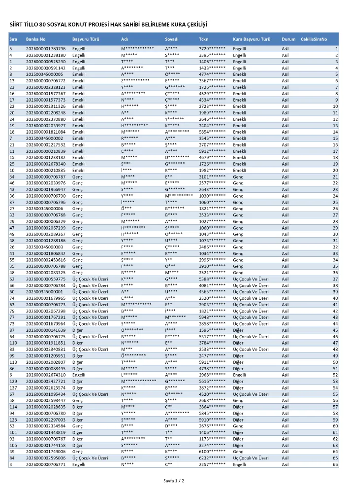 Toplu Konut İdaresi Başkanlığı tarafından yürütülen 500 bin sosyal konut projesi kapsamında Tillo ilçesi için yapılan kura çekimi sonuçlandı.