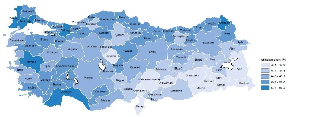 İstihdam oranlarına bakıldığında, Türkiye genelinde 2023 yılı için istihdam oranı yüzde 48,3 olarak kaydedildi. Bu oran, Ardahan'da yüzde 58,2 ile en yüksek seviyede, Siirt'te ise yüzde 35,5 ile en düşük seviyede gerçekleşti.