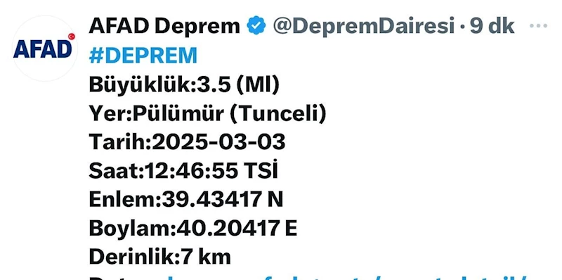 AFAD’dan yapılan açıklamada, saat 12.46’da merkez üssü Tunceli’nin Pülümür ilçesi olan 3.5 büyülüğünde deprem meydana geldiği belirtili. Yerin 7 kilometre altında meydana gelen depremde herhangi bir olumsuzluğun oluşmadığı öğrenildi.