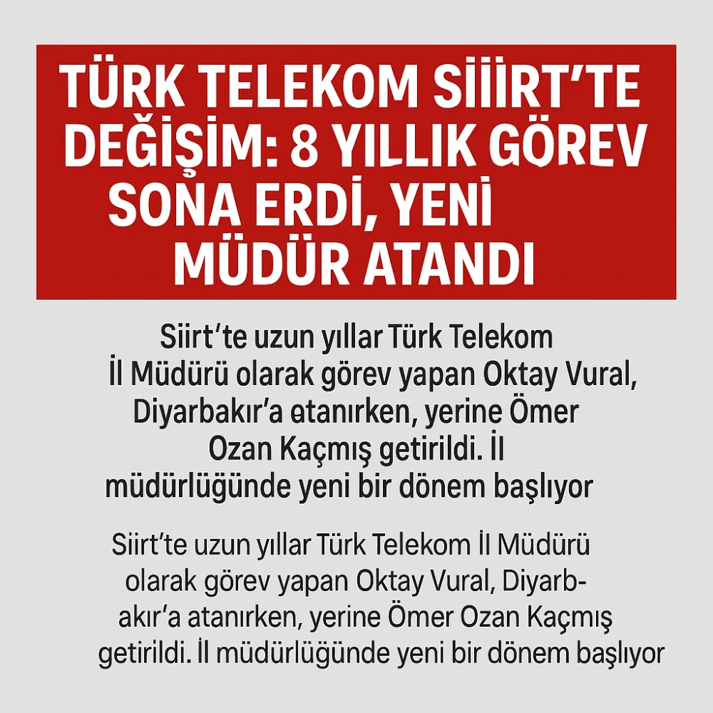 Türk Telekom Siirt İl Müdürlüğü'nde dikkat çeken bir görev değişikliği yaşandı. 2016 yılından bu yana il müdürlüğü görevini yürüten Oktay Vural, Diyarbakır Bölge ESS Müdürü görevine atandı. Vural’ın yerine ise, Türk Telekom Diyarbakır kadrosundan Ömer Ozan Kaçmış, Siirt İl Müdürü olarak görevlendirildi.