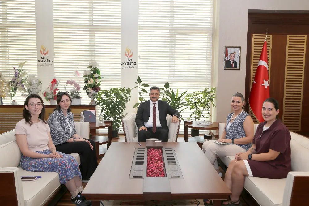 Siirt Üniversitesi Güzel Sanatlar ve Tasarım Fakültesi öğretim üyesi Dr. Eda Koçak ile Gebze Teknik Üniversitesi öğretim üyesi Doç. Dr. Melis Oğuz Çevik, Arş. Gör. Burcu Soygüzeloğlu ve Selin Aslan Şenol, Rektör Prof. Dr. Nihat Şındak’ı makamında ziyaret etti.