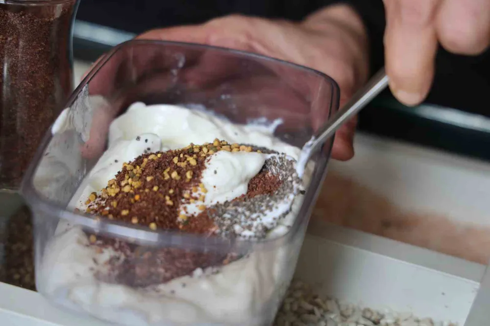 Üzüm çekirdeği tozu, yoğurt, polen ve chia tohumundan oluşan karışımdaki antioksidan özelliğe dikkat çeken Tıbbi ve Aromatik Bitkiler Teknikeri Ayşen Çebiç, "Özellikle içerisinde protein, vitamin, bağışıklık güçlendirici, bununla birlikte kan ve demir takviyesi yapan bir karışım yaptık. Bu karışımımızın ana maddelerinden birisi yoğurt. Yoğurt tercih ederken de ev yapımı olmasını öneriyoruz. Hazır yoğurtları çok fazla tercih etmeyin diyoruz. Tabii evde yoğurdunu yapamayan kişiler hazır yoğurdu alıp tüketebilir. Ev yoğurdu olmasına özellikle önem vermemizin sebeplerinden bir tanesi, hem kalsiyum açısından hem protein açısından hem de diğer malzemelerle etkileşimi açısından ev yoğurdumuz daha zengin besin kaynağı. Bununla birlikte içerisine katılan üzüm çekirdeği, günümüzde çok fazla kişide kan ve demir problemi var. ‘Kan eksikliğim, demir eksikliğim var’ diye çok fazla danışanım var. Yoğurdun üzüm çekirdeğiyle birlikte tüketilmesi hem kan takviyesi açısından hem de demir takviyesi açısından çok büyük bir öneme sahip. Karışım içerisine eklediğimiz polen olarak arı ürünleri kişinin bağışıklığını güçlendirmesi açısından çok önemlidir. Karışımımızda polenimizi de kullandık, polen hem bağışıklığı güçlendirici özelliği sayesinde hem de hastalıklara karşı kişinin metabolizmasına, bağışıklığını güçlendirici etkisi sayesinde çok fazla tercih ediyoruz. Son dönemlerde çok fazla satılan ürünlerden bir tanesi chia tohumu. Çocuğundan yaşlısına kadar herkesin gönül rahatlığıyla tüketebileceği bir ürün. İçerisinde kolajen barındırması sebebiyle kişiye hem kolajen takviyesi yapar, hem kemikleri güçlendirir. Bununla birlikte diyet yapanlarda aynı zamanda çok hareketli iş ortamında çalışanlarda faydası var" şeklinde konuştu.