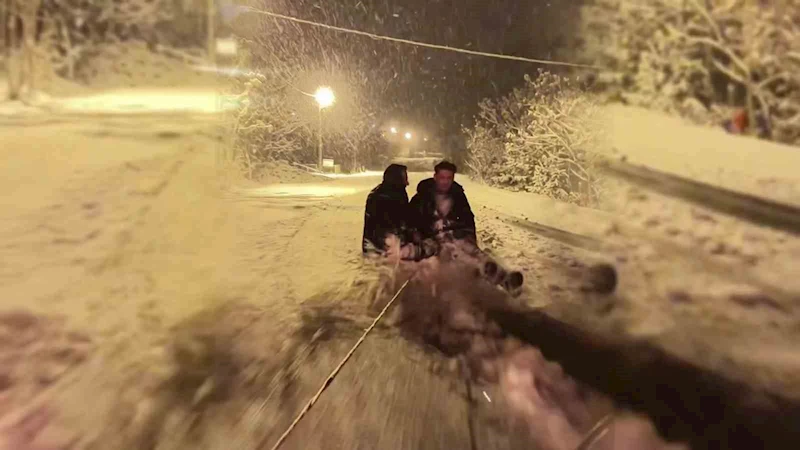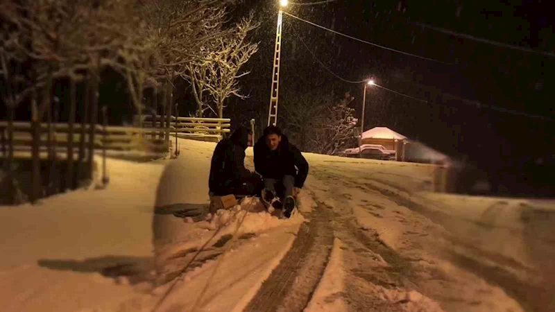 Erzurum’un Uzundere ilçesinde gençler karla beyaza bürünen sokaklarda kızakla kayarak eğlendi.