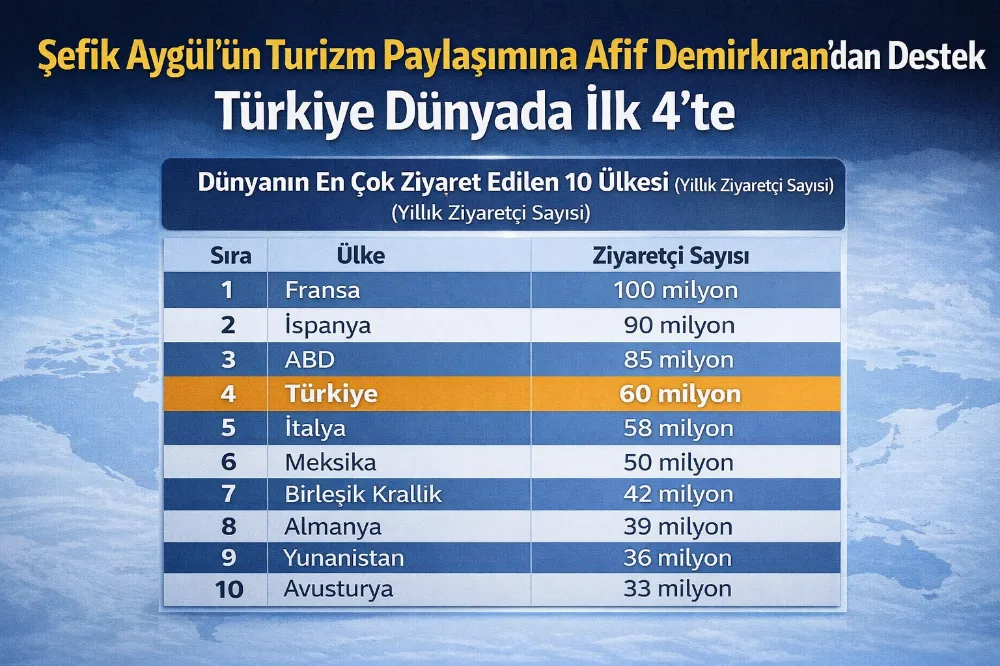 Başkan Afif Demirkıran’ın paylaşımı, Türkiye’nin turizmde ulaştığı güçlü konuma verilen açık bir destek olarak değerlendirilirken, veriler Türkiye’nin küresel ölçekteki yerini bir kez daha gözler önüne serdi.