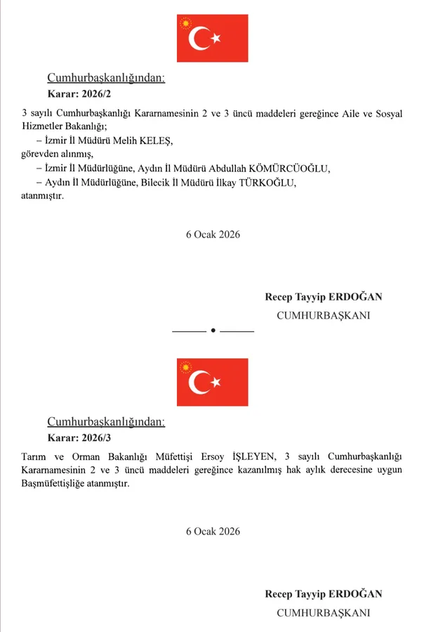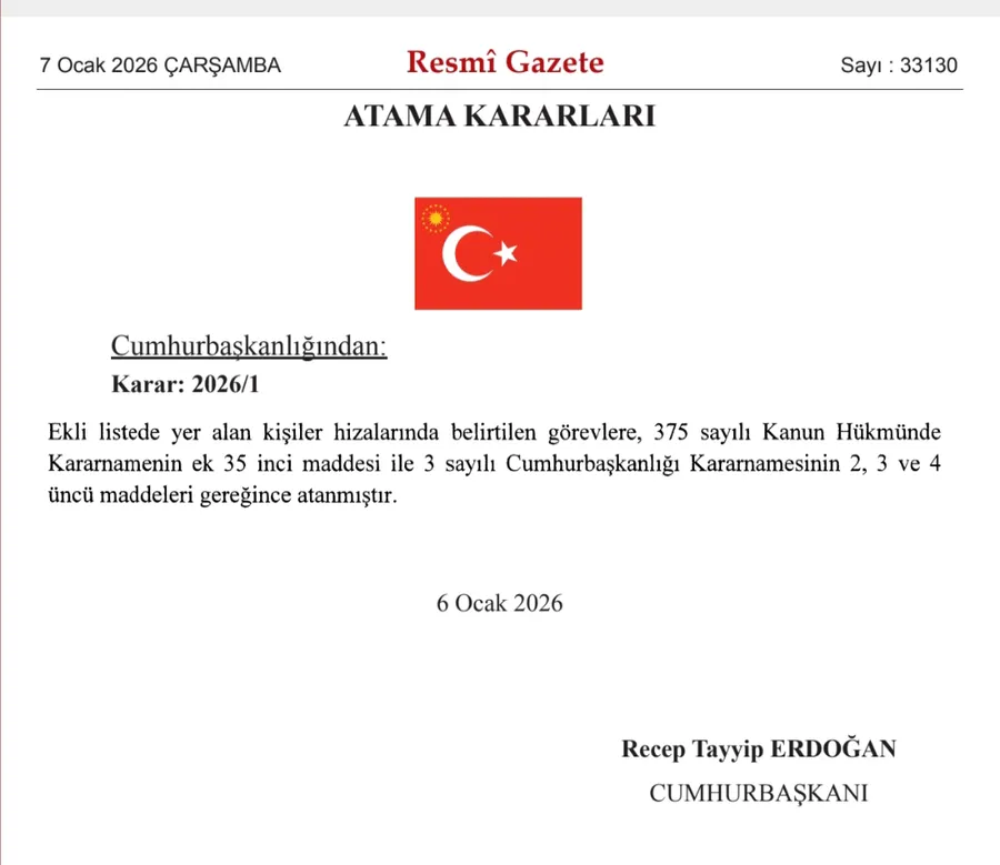 Söz konusu atamalar; 375 sayılı KHK ile 3 sayılı Cumhurbaşkanlığı Kararnamesi hükümleri uyarınca gerçekleştirildi ve 6 Ocak 2026 tarihli kararlarla yürürlüğe girdi. Kararlar, Recep Tayyip Erdoğan imzasıyla Resmî Gazete’de yayımlandı.