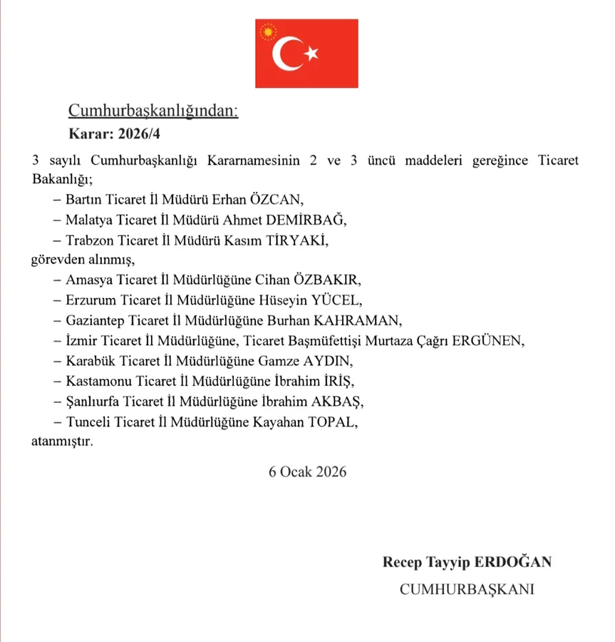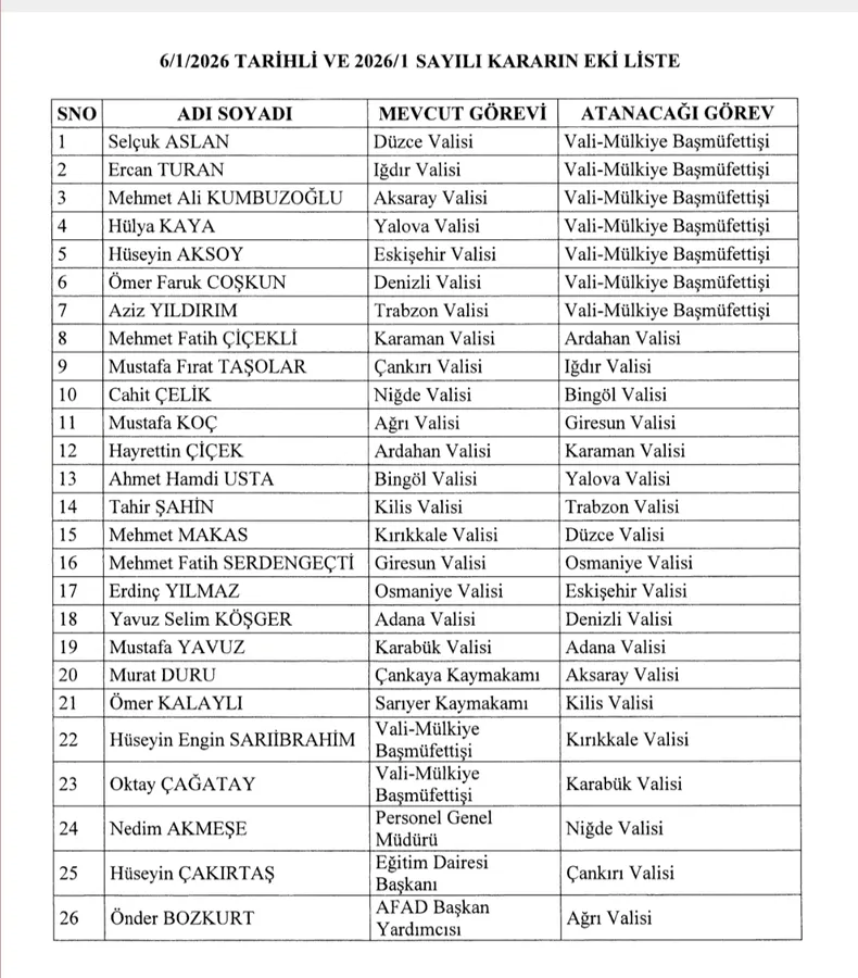 Cumhurbaşkanlığı tarafından hazırlanan ve 7 Ocak 2026 tarihli Resmî Gazete’de yayımlanan 2026/1, 2026/2, 2026/3 ve 2026/4 sayılı kararlar ile valiler başta olmak üzere çok sayıda üst düzey kamu yöneticisinin görev yerlerinde değişikliğe gidildi.