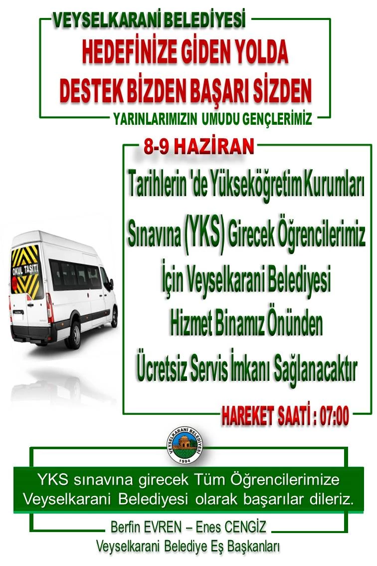 Veysel Karani Belediyesi, hafta sonu yapılacak olan Yükseköğretim Kurumları Sınavına (YKS) girecek öğrencileri ücretsiz taşıyacak.