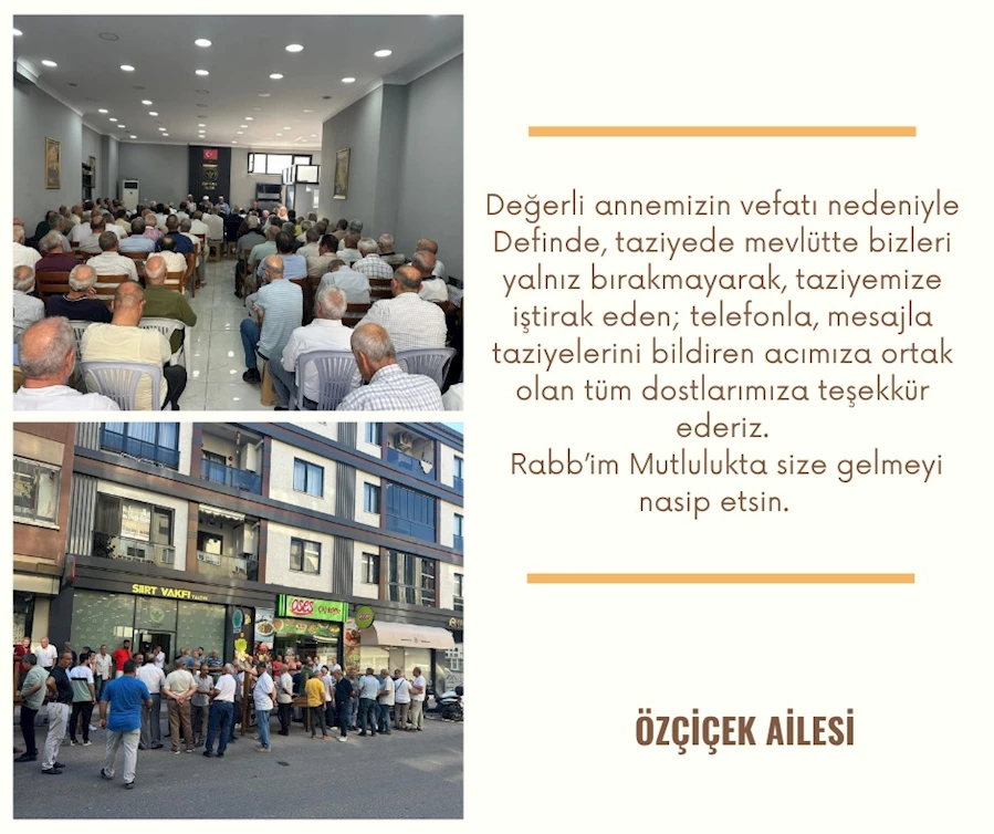 “Değerli annemizin vefatı nedeniyle defin, taziye ve mevlütte bizleri yalnız bırakmayan; telefonla, mesajla taziyelerini bildiren acımıza ortak olan tüm dostlarımıza teşekkür ederiz. Rabb’im mutlulukta size gelmeyi nasip etsin.”