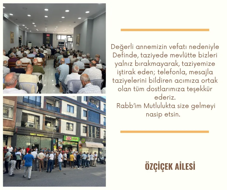 Defin sonrası başlayan taziye süresince vatandaşlar Cengiz Özçiçek ve ailesini yalnız bırakmadı. Gerek taziye mekanında birebir, gerekse telefon ve mesaj yoluyla iletilen yüzlerce taziye dileği, aileye moral ve destek oldu. Yalova’daki Siirtliler, birlik ve dayanışma içinde örnek bir vefa duruşu sergiledi.
