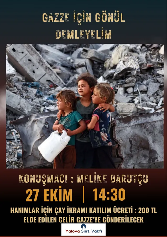 Program afişinde yer alan savaş enkazı içindeki çocuk görseli, etkinliğin duygusal yönünü derinleştiriyor. Yalova Siirt Vakfı yetkilileri, “Bu çay demlemek, aslında bir vicdan demlemektir” diyerek herkesi destek olmaya davet etti.