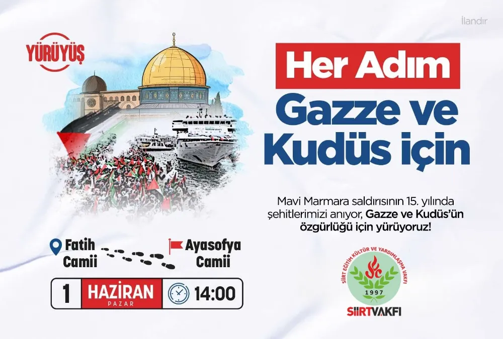 Siirt Eğitim Kültür ve Yardımlaşma Vakfı (SİİRTVAKFI), Mavi Marmara saldırısının 15. yıl dönümünde anlamlı bir etkinliğe imza atıyor. 1 Haziran Pazar günü saat 14.00’te Fatih Camii’nden Ayasofya Camii’ne gerçekleştirilecek yürüyüşte, Gazze ve Kudüs’ün özgürlüğü için ses yükseltilecek.