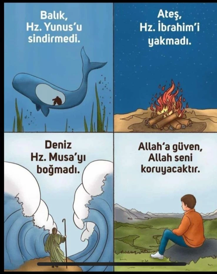 -- Hz. İbrahim (a.s.), Nemrut’un odun yığınlarıyla tutuşturduğu dev ateşe atıldığında bile, “Hasbiyallahu ve ni’mel vekil” diyerek tevekkül etti. Rabbimiz ateşe, “Ey ateş! İbrahim’e serin ve selamet ol” emrini verdi. Ateş, Rabbini tanıdı; yakmadı.